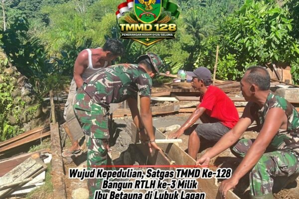 Seluma – Dalam rangka kemanunggalan TNI bersama masyarakat, program TNI Manunggal Membangun Desa (TMMD) ke-128 Kodim 0425/Seluma terus berinovasi untuk meningkatkan kesejahteraan masyarakat. Salah satu proyek yang sedang dilaksanakan adalah pembangunan Rumah Tidak Layak Huni (RTLH) ke-3 milik Ibu Betauna (63) yang berlokasi di Desa Lubuk Lagan, Kecamatan Talo Kecil, Kabupaten Seluma, pada Minggu (26…
