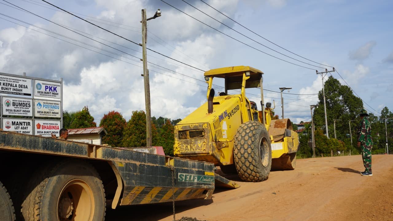 Kotawaringin Timur – Satgas TMMD Reguler ke-127 Kodim 1015/Sampit terus meningkatkan kualitas pembangunan infrastruktur desa, khususnya dalam pengerasan jalan perkebunan yang kini sudah berada pada tahap akhir, pada Senin (09/03/2026). Untuk mendukung kegiatan ini, Satgas menghadirkan alat berat jenis bomag, yang berfungsi dalam proses pemadatan jalan agar hasil akhir lebih optimal.