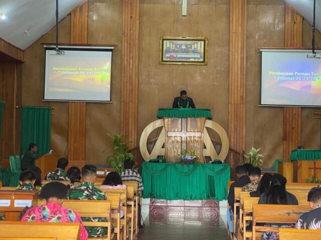Moanemani – Bertempat di gereja Koinonia Moanemani, Kampung Ikebo, Distrik Kamuu Kabupaten Dogiyai Serka Steward Tapilatu (Babinsa Koramil 1705-04/Moanemani) melaksanakan Kegiatan ibadah minggu.