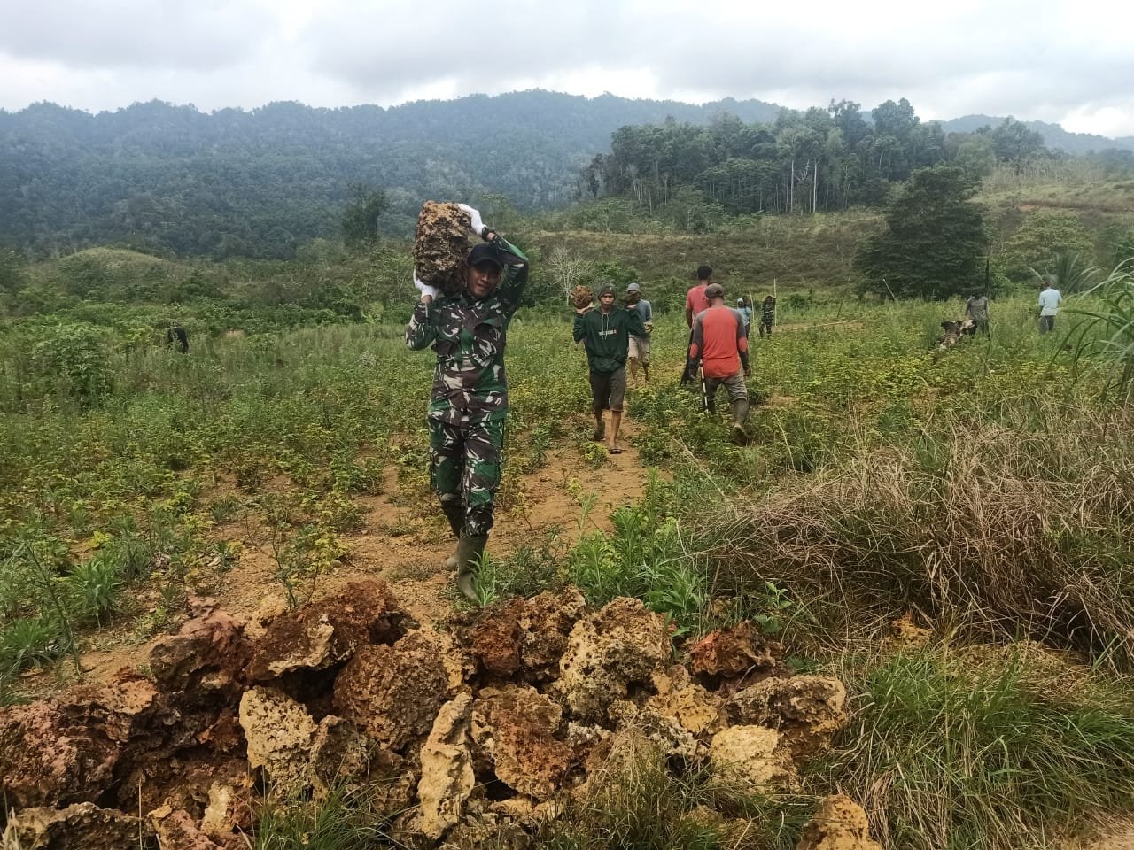 Dengan penuh semangat, para prajurit dan warga turun langsung ke sungai dan sekitar perbukitan untuk mengumpulkan batu yang akan digunakan sebagai bahan utama dalam pembangunan deker. Kegiatan ini dilakukan secara gotong royong demi mempercepat proses penyelesaian sasaran fisik.