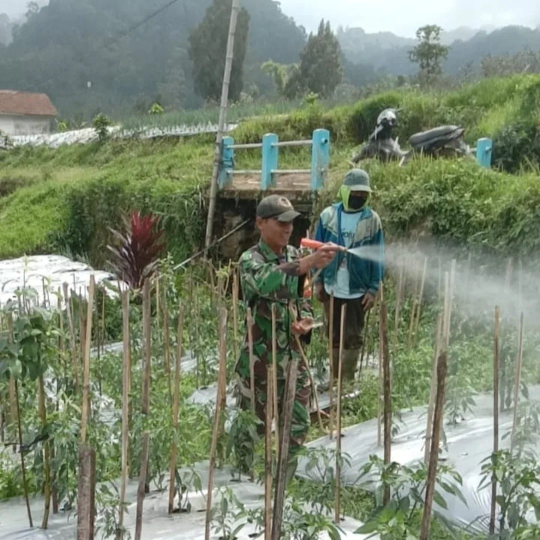 Dukung Ketahanan Pangan Nasional, Babinsa Koramil 0819/24 Tutur Serka Nofi Hari melaksanakan kegiatan penyemprotan hama tanaman cabai milik petani di Desa Ledok, Kecamatan Tutur, Kabupaten Pasuruan. Rabu, (08/01/2025)
