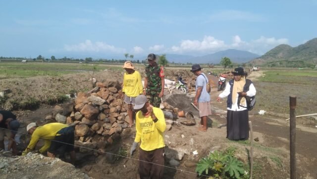 Dompu, NTB – Kamis (6/11/2025) pukul 09.30 WITA, Serma Ridwan, Babinsa Koramil 1614-03/Huu Desa Cempi Jaya, bersama Kepala Dusun dan tokoh masyarakat mendampingi PPL dalam kegiatan peletakan batu pertama pembuatan irigasi di Dusun Sigi. Kegiatan ini merupakan bagian dari upaya pemerintah desa dan Dinas PUPR NTB untuk meningkatkan infrastruktur pertanian di wilayah tersebut.