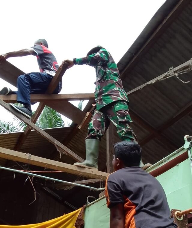 ACEH BARAT – Babinsa Koramil 02/Woyla Kodim 0105/Abar, Serka Iman, bersama anggota BPBD dan warga setempat melakukan pemasangan seng atap rumah warga pasca terjadinya hujan deras disertai angin puting beliung pada hari Sabtu yang lalu. Angin puting beliung tersebut menyebabkan 17 rumah warga dan 1 balai pengajian rusak di Desa Lueng Tanoh Tho, Kecamatan Woyla, Kabupaten Aceh Barat, Selasa (05/08/2025).