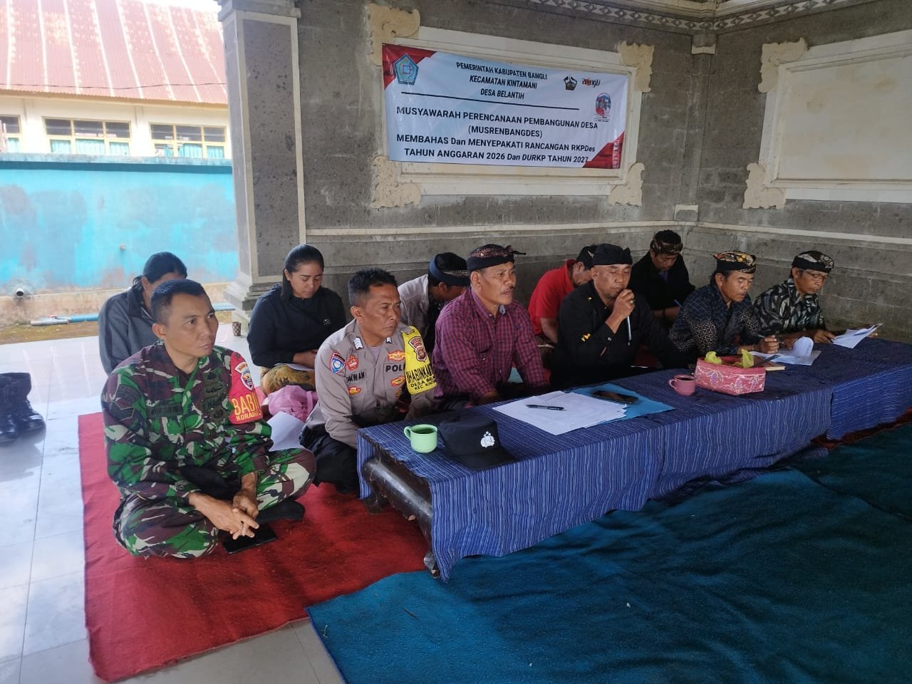 Babinsa Desa Belantih, Sertu I Made Sukanadi menyampaikan, “Sebagai Babinsa, kami selalu siap mendukung pemerintah desa dalam merencanakan program pembangunan yang berpihak pada masyarakat. Melalui Musrenbangdes ini, kami harapkan setiap program dapat disusun secara tepat sasaran dan membawa manfaat nyata bagi warga Desa Belantih.”