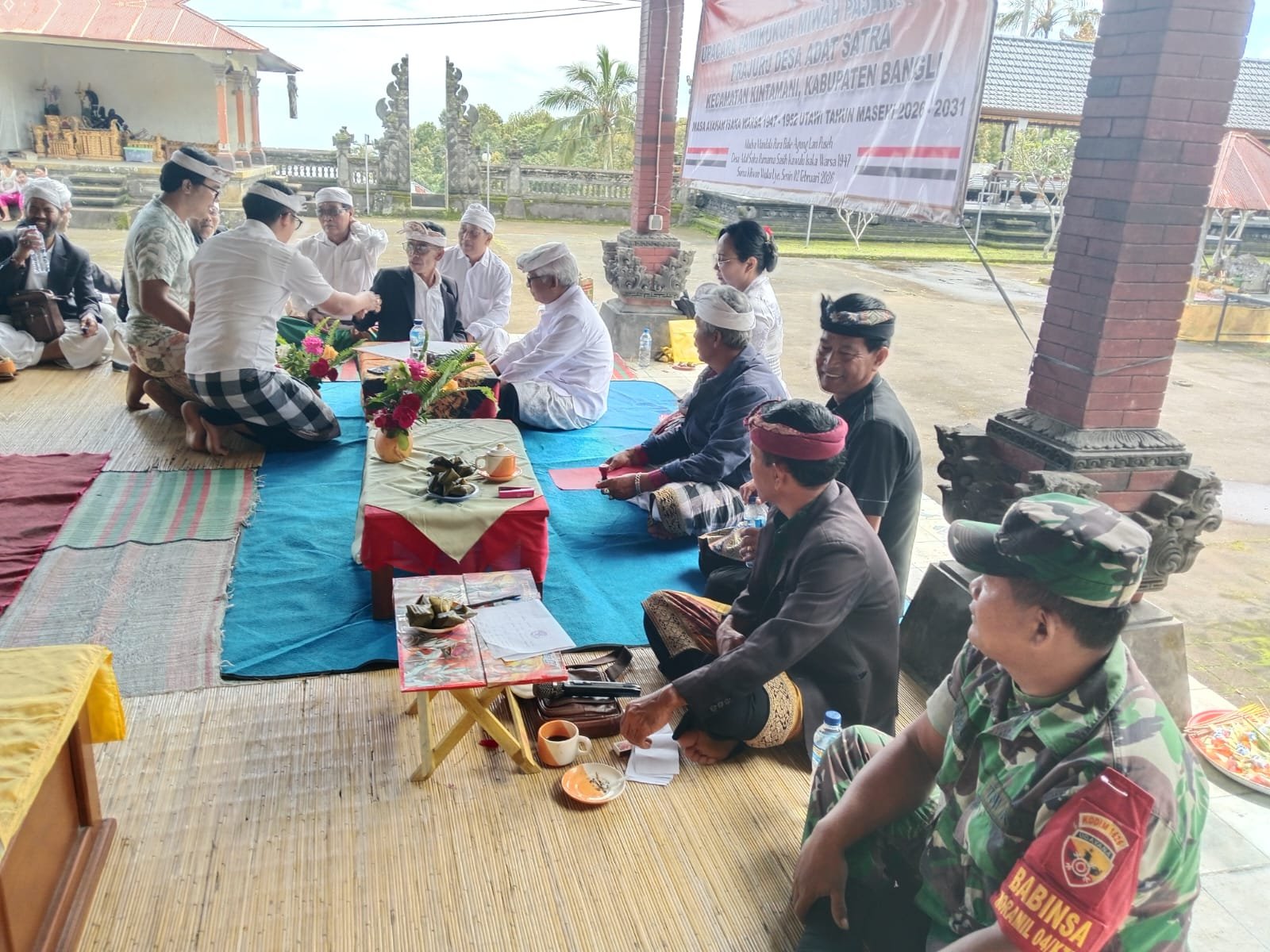 Bangli – Dalam rangka pelantikan Bendesa Adat Desa Satra, I Made Sukarata, Babinsa Desa Satra, Sertu I Wayan Pasbudi, turut serta dalam Upacara Pamikukuh Miwah Pajaya Jayaan yang diadakan pada Senin, 2 Februari 2026, pukul 10.00 WITA di Pura Bale Agung, Kecamatan Kintamani, Kabupaten Bangli. Kegiatan ini merupakan momen penting bagi masyarakat setempat, sebagai bentuk pengesahan pemimpin baru yang akan memimpin Desa Adat Satra.