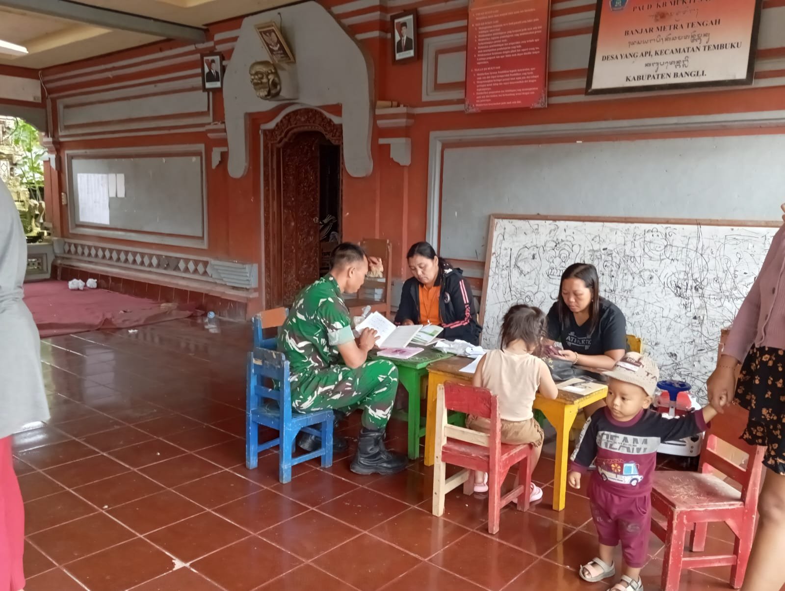 Bangli – Dalam upaya mendukung program pemerintah di sektor kesehatan serta memastikan pertumbuhan anak berlangsung dengan baik, Babinsa Desa Yangapi dari Koramil 1626-03/Tembuku, Serda I Made Sibin Suputra, melakukan pendampingan dan pengawasan terhadap kegiatan Posyandu Balita yang berlangsung di Balai Banjar Dinas Metra Tengah, Desa Yangapi, Kecamatan Tembuku, Kabupaten Bangli, pada Sabtu (21/02/2026).