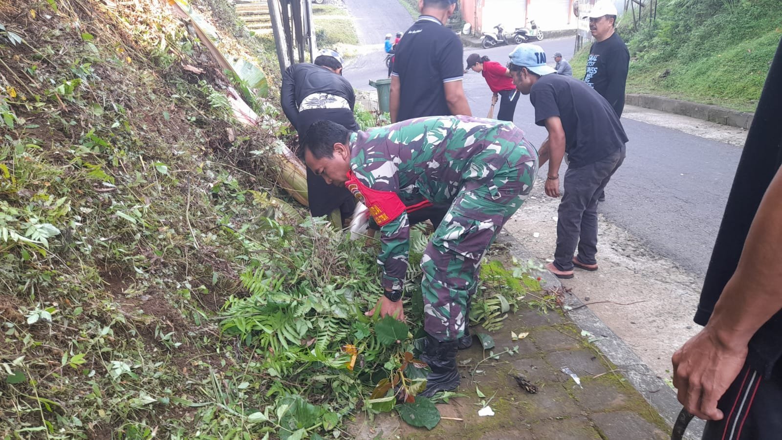 Kegiatan gotong royong ini dilakukan dengan sasaran pembersihan rumput liar dan sampah di sepanjang bahu jalan yang mulai tertutup oleh tanaman liar. Babinsa bersama warga secara bergotong royong mencabut, menyapu, dan mengumpulkan sampah untuk menciptakan lingkungan yang tertata rapi, bersih, dan nyaman.
