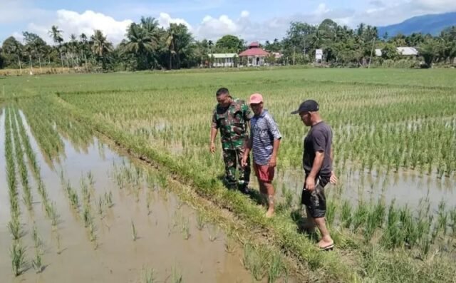 Aceh Barat Daya – Babinsa Koramil 04/Susoh Kodim 0110/Abdya, Serka Joni Warman, mendampingi keujrun tani meninjau perkembangan tanaman padi yang telah memasuki fase generatif di areal persawahan Desa Pawoh, Kecamatan Susoh, Minggu (9/11/2025).