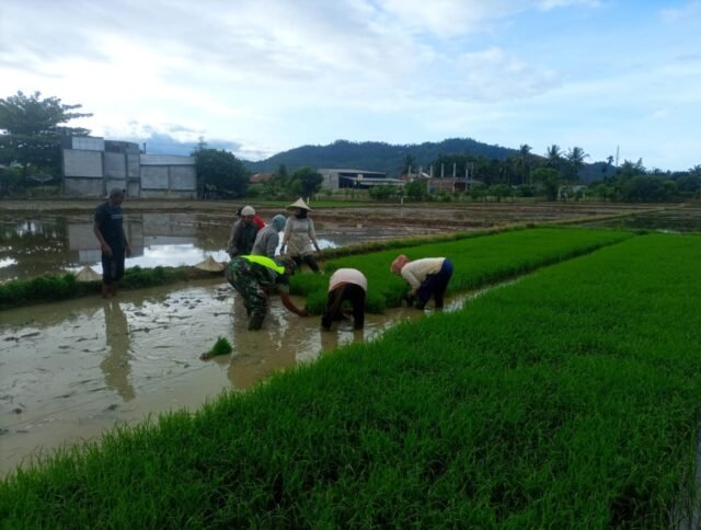 ACEH JAYA – Babinsa Koramil 01/Jaya Kodim 0114/Aceh Jaya Koptu Aris Kartiko membantu kelompok tani Tuan Saheh dalam kegiatan menanam padi di lahan milik Pak Sayed yang berlokasi di Desa Lamme, Kecamatan Jaya, Kabupaten Aceh Jaya, Rabu (22/10).