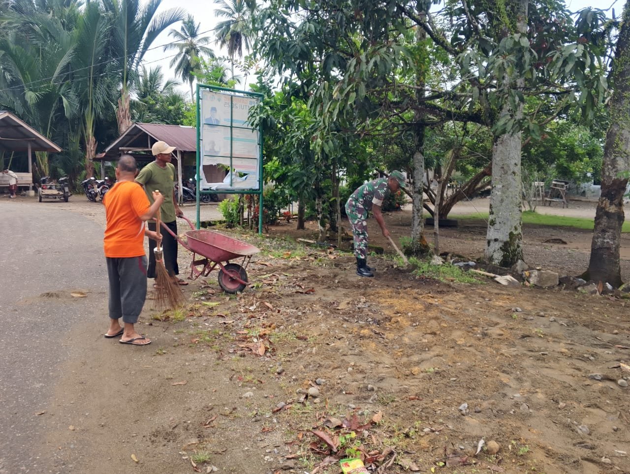 ACEH JAYA — Babinsa Koramil 01/Jaya Kodim 0114/Aceh Jaya, Koptu Rahmat, melaksanakan kegiatan Komunikasi Sosial (Komsos) sekaligus karya bakti bersama warga binaan dengan membantu penataan pekarangan Meunasah di Desa Lamtui, Kecamatan Jaya, Kabupaten Aceh Jaya, Selasa (27/01/2026).