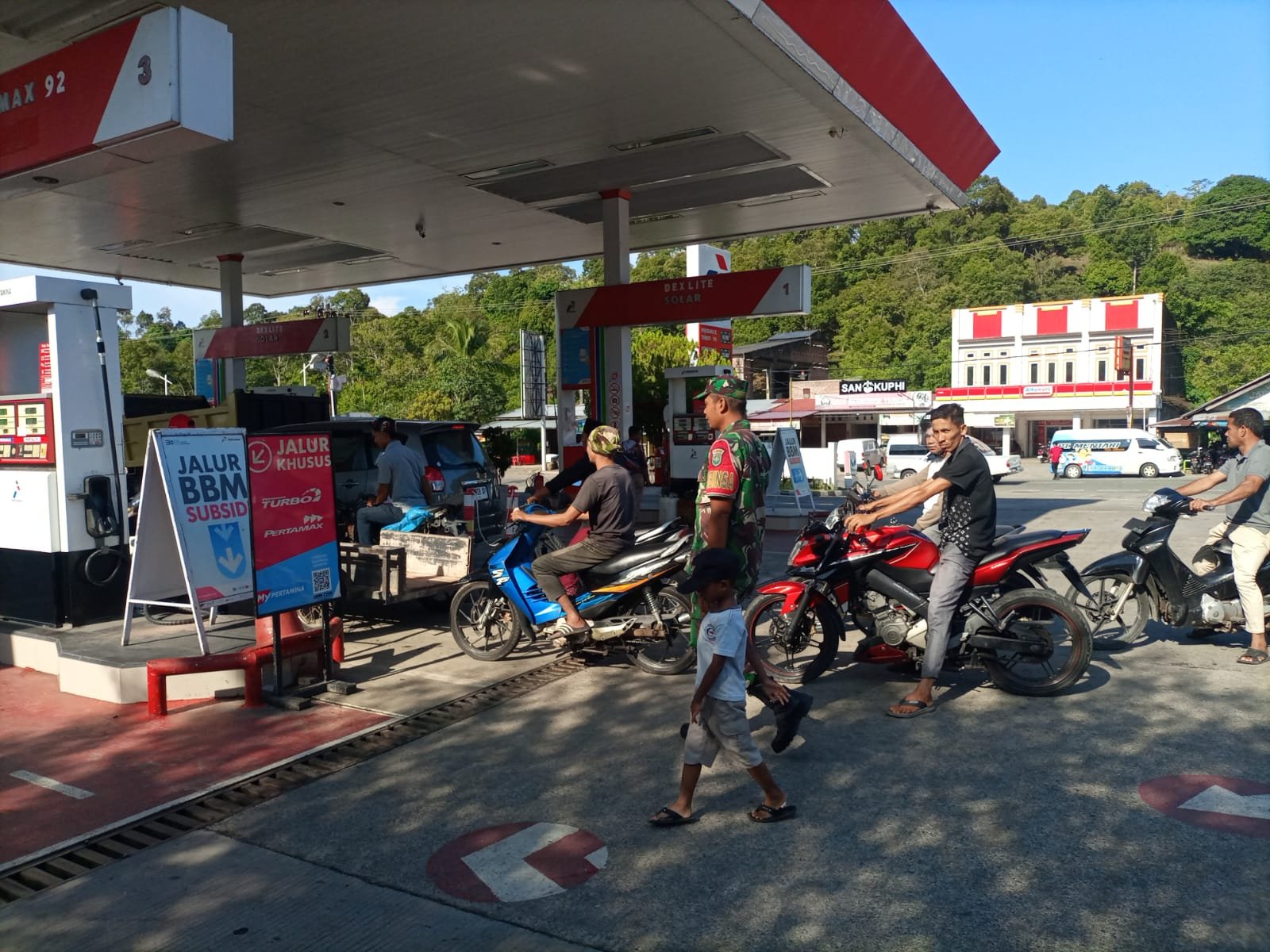 Kehadiran aparat TNI di tengah aktivitas masyarakat juga memberikan rasa aman bagi para konsumen yang sedang mengantre untuk mengisi bahan bakar.