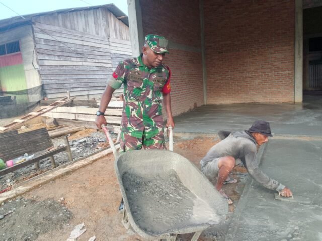 Dalam kegiatan tersebut, Kopka Roni Gunawan tampak bahu-membahu bersama tukang bangunan mengangkat dan mengantar adukan semen yang digunakan untuk pengecoran lantai rumah milik Bapak Sutri Daud, salah satu warga setempat.