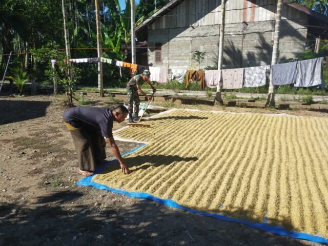 ACEH BARAT – Sebagai bentuk kepedulian terhadap masyarakat binaannya, Babinsa Koramil 0105-10/Woyla Barat Kodim 0105/Aceh Barat, Sertu Rahmatul Maulid, turut membantu warga menjemur padi hasil panen di Desa Ulee Pasi Ara, Kecamatan Woyla Barat, Kabupaten Aceh Barat, Minggu (12/10/2025).