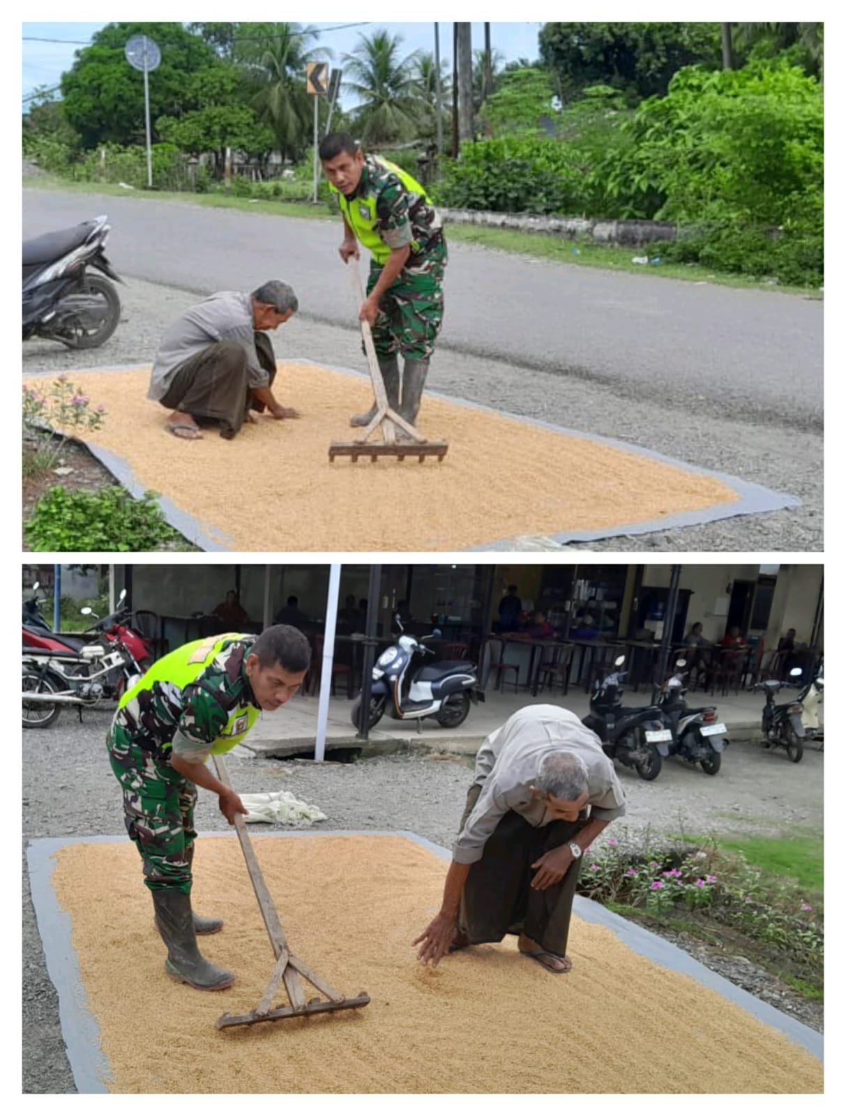 Saat membantu menjemur padi, Pelda T. Fahrial Putra juga memberikan edukasi kepada petani tentang pentingnya pengeringan yang baik untuk menjaga kualitas gabah agar tidak mudah busuk dan memiliki nilai jual yang lebih baik.