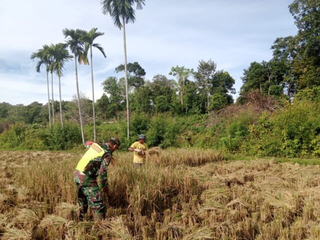 ACEH BARAT – Serka Abdul Talib, Babinsa Koramil 03/Kaway XVI Kodim 0105/Aceh Barat, menunjukkan kepeduliannya dengan terjun langsung membantu warga panen padi di Desa Muko, Kecamatan Kaway XVI, Kabupaten Aceh Barat, Selasa (14/10/2025).