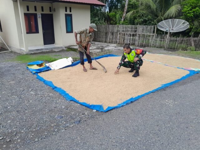 ACEH BARAT – Pelda T. Fahrial Putra, yang akrab disapa Pak Ampon, Babinsa Koramil 03/Kaway XVI Kodim 0105/Aceh Barat, kembali menunjukkan kedekatan dan kepeduliannya terhadap masyarakat. Kali ini, ia terlihat membantu warga menjemur padi di Desa Keude Aron, Kecamatan Kaway XVI, Kabupaten Aceh Barat, Selasa (21/10/2025).