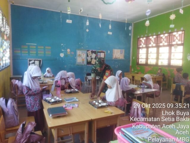 ACEH JAYA – Babinsa Koramil 03/Setia Bakti Kodim 0114/Aceh Jaya, Serda Zainal Aripin, melakukan pemantauan kegiatan pendistribusian Makan Bergizi Gratis (MBG) beserta snack kepada para siswa SDN 03 Setia Bakti di Desa Lhok Buya, Kecamatan Setia Bakti, Kabupaten Aceh Jaya, Rabu (29/10/2025).
