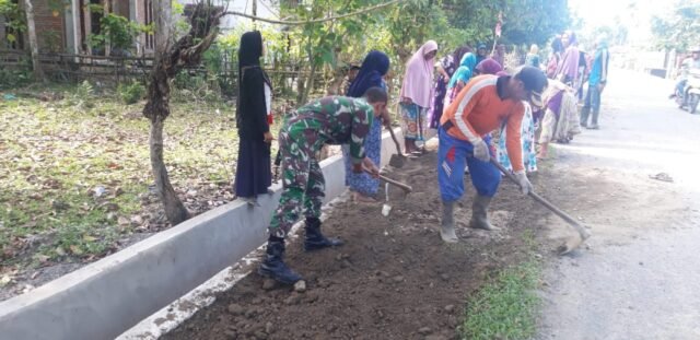 Di lokasi, Sertu Sugeng Ariono tidak hanya mengarahkan, tetapi juga ikut memegang alat sekop dan cangkul guna meratakan material yang ada.