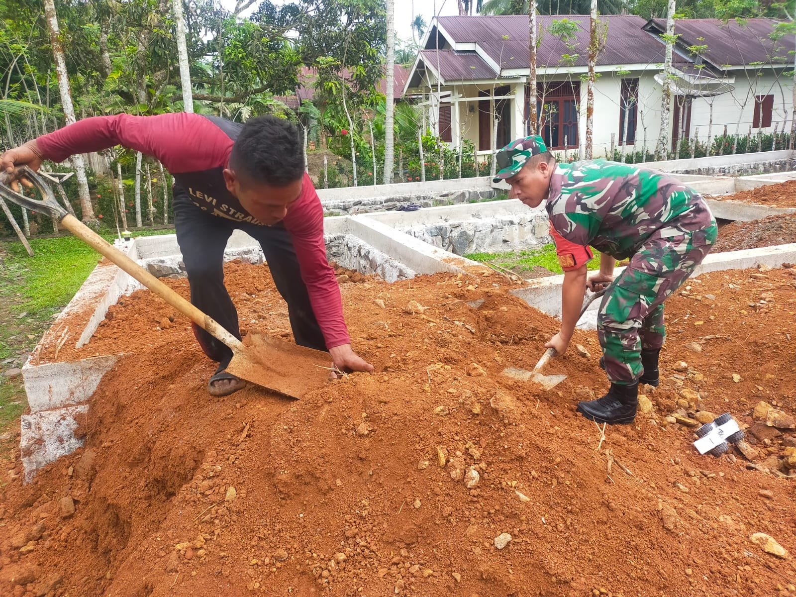 ACEH JAYA – Babinsa Koramil 05/Panga Kodim 0114/Aceh Jaya, Serda Suryadi Putra, melaksanakan kegiatan karya bakti dengan membantu memasukkan tanah timbunan pada pondasi rumah milik salah seorang warga binaan, Tarmudin (41), di Desa Gampong Harapan, Kecamatan Panga, Kabupaten Aceh Jaya, Minggu (28/12/2025).