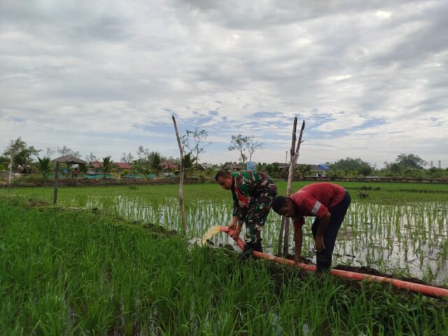ACEH BARAT – Bintara Pembina Desa (Babinsa) Koramil 07/Johan Pahlawan, Kodim 0105/Aceh Barat, Sertu Eriska, melaksanakan kegiatan pemantauan stok air di persawahan masyarakat Desa Kuta Padang pada Minggu (15/06/2025).