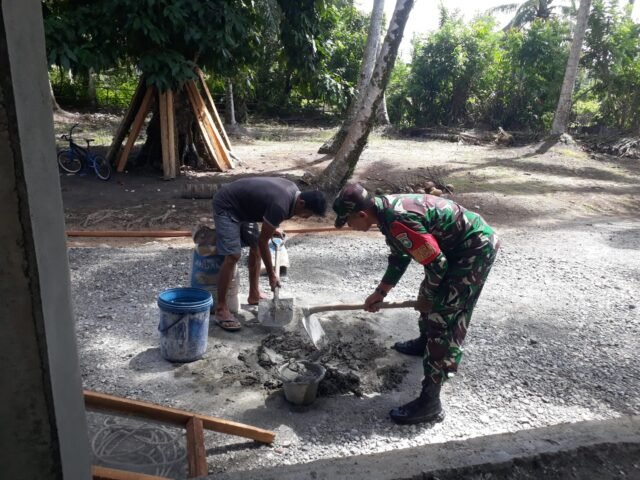 ACEH BARAT – Dalam semangat kemanunggalan TNI dengan rakyat, Babinsa Koramil 09/Samatiga Kodim 0105/Aceh Barat, Serda M. Sofyan, menunjukkan kepedulian dan kedekatan nyata dengan warga binaannya. Ia membantu pembangunan rumah milik salah satu warga Gampong Cot dengan ikut mengaduk air semen dan bergotong royong bersama masyarakat setempat, Selasa (21/10/2025).