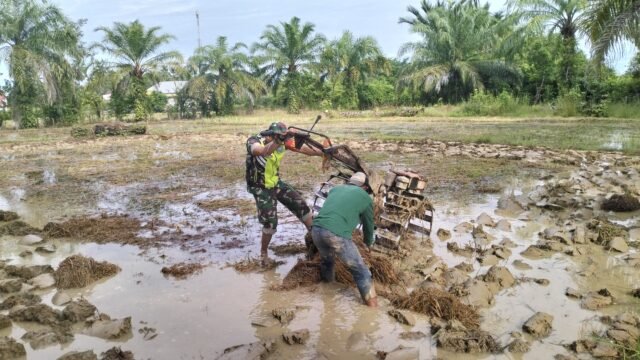 Sertu Puguh tampak bekerja berdampingan dengan Pak Samsul, seorang petani lokal yang tengah mengolah lahan untuk persiapan musim tanam padi. Di tengah kondisi sawah yang berlumpur dan cukup menantang, keduanya bahu-membahu mengoperasikan mesin bajak (Hand Traktor) yang sempat mengalami kendala teknis akibat medan yang berat. Meski berlumpur dan hampir tenggelam, semangat mereka tak surut.