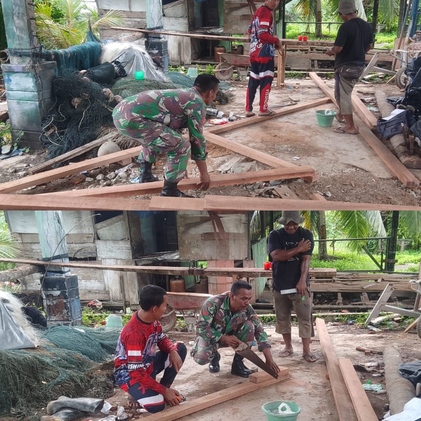 Dalam kegiatan tersebut, Koptu Usuluddin mendampingi Bapak Puad, salah seorang warga setempat, yang sedang membuang serta menyusun kayu untuk rangka rumah dalam rangka pemasangan atap seng. Kegiatan gotong royong ini berlangsung penuh semangat dan kebersamaan.