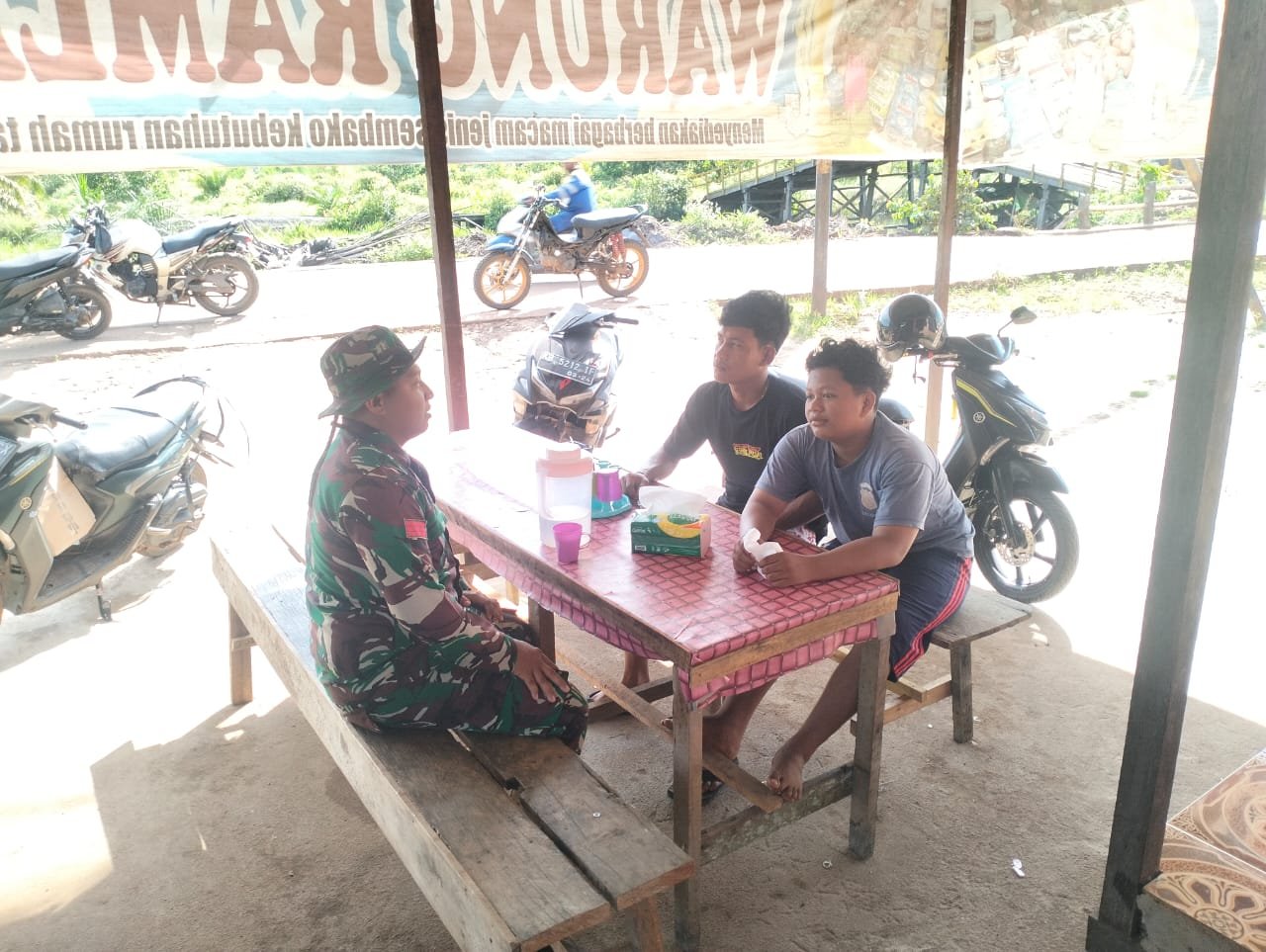 Ketapang – Dalam rangka mempererat hubungan dan menjalin tali silaturahmi dengan masyarakat binaan, Babinsa Koramil 1203-13/Matan Hilir Selatan (MHS) Praka Muhammad Ade Riyatno melaksanakan kegiatan komunikasi sosial (Komsos) bersama warga.