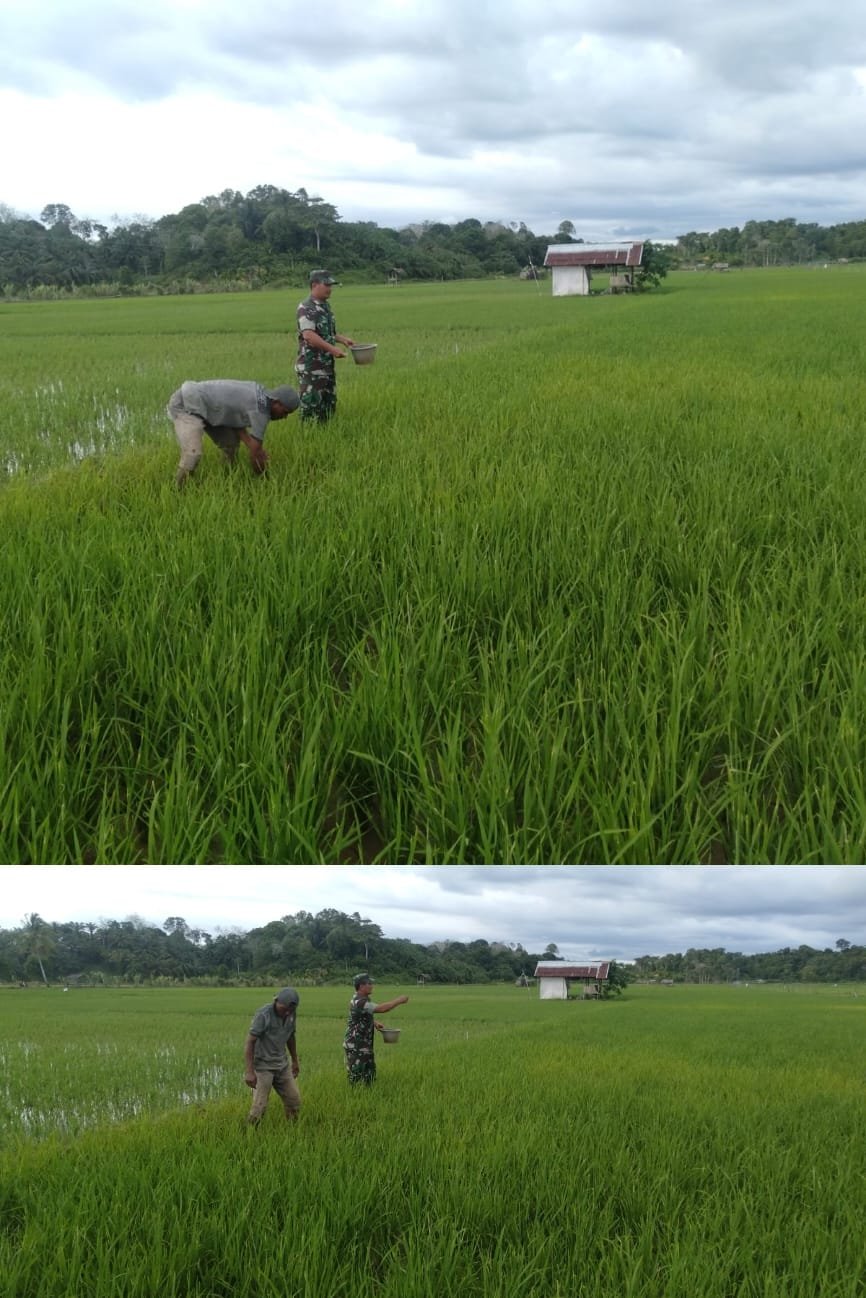 Dalam kegiatan tersebut, Serda Hendri terjun langsung ke sawah bersama petani untuk melakukan perawatan tanaman padi yang saat ini telah memasuki tahap pemupukan. Pupuk yang digunakan antara lain pupuk Urea dan NPK guna menunjang pertumbuhan tanaman agar lebih optimal.