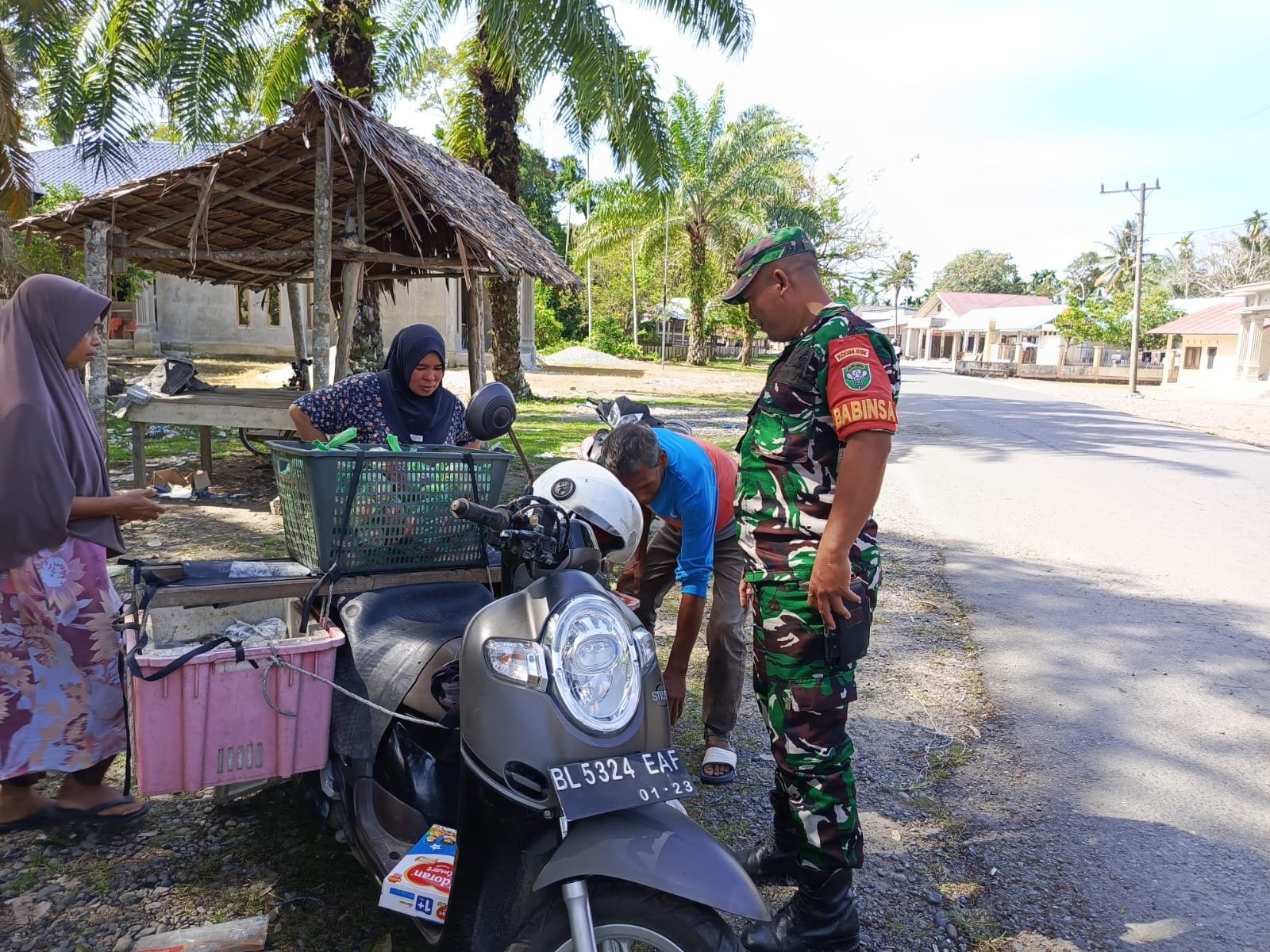 ACEH JAYA – Babinsa Posramil Pasie Raya Kodim 0114/Aceh Jaya, Sertu Syamsul, melaksanakan komunikasi sosial (komsos) bersama pedagang ikan keliling di Desa Pasi Teubee, Kecamatan Pasie Raya, Minggu (01/03/2026).