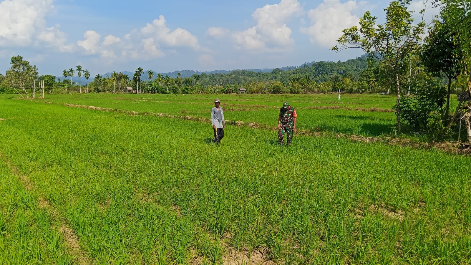 Dalam kegiatan itu, Babinsa berdialog langsung dengan pemilik lahan untuk mengetahui kendala yang dihadapi petani serta memberikan motivasi agar tetap semangat dalam mengelola lahan pertanian. Babinsa juga mengingatkan pentingnya pengaturan air dan perawatan tanaman secara maksimal guna menjaga keberlangsungan produksi padi.