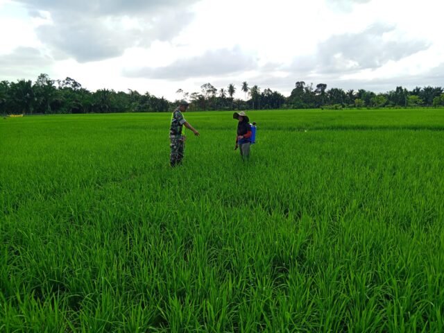 ACEH BARAT – Babinsa Posramil 06/Bubon Kodim 0105/Aceh Barat, Sertu Endi Suhendi, menunjukkan kepeduliannya terhadap sektor pertanian dengan terjun langsung ke sawah membantu petani melakukan pendampingan penyemprotan hama tanaman padi di Desa Liceh, Kecamatan Bubon, Kabupaten Aceh Barat, Kamis (17/07/2025).