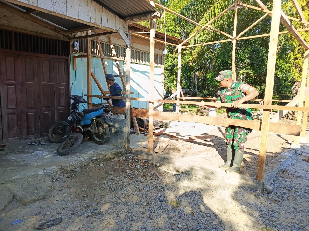 Dalam kegiatan tersebut, Babinsa turut membantu proses pembangunan sekaligus memberikan pendampingan kepada tukang yang bekerja di lokasi. Kehadiran Babinsa merupakan wujud kepedulian TNI terhadap upaya masyarakat dalam meningkatkan perekonomian keluarga melalui usaha mandiri.