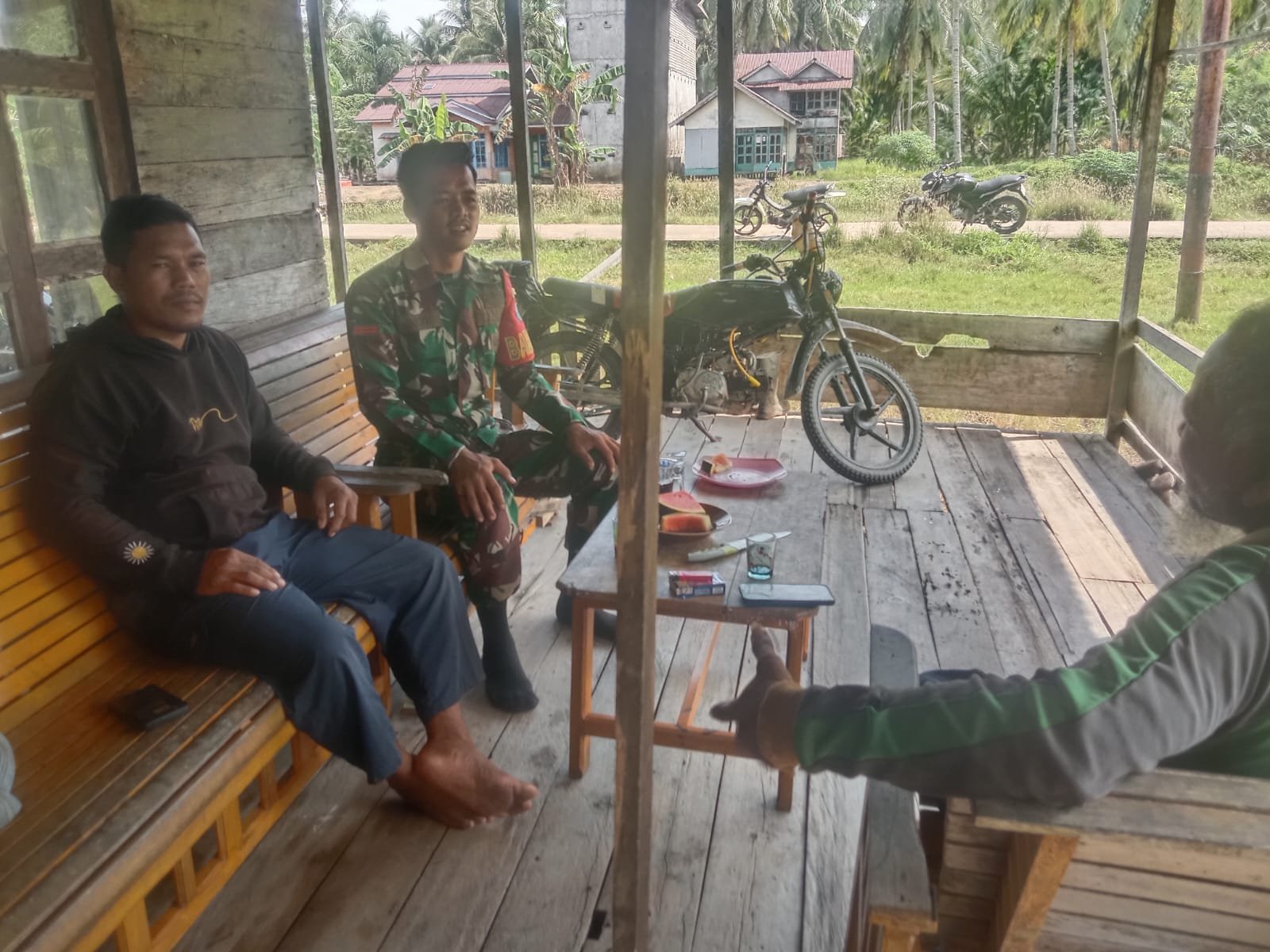 Kayong Utara – Babinsa Koramil 1203-08/Pulau Maya, Pratu Saeri, melaksanakan kegiatan komunikasi sosial (Komsos) dan anjangsana bersama warga di kediaman Bapak Abdul Salim, Dusun Limau Manis, Desa Satai Lestari, Kecamatan Pulau Maya, Kabupaten Kayong Utara, pada Senin (3/11/2025).