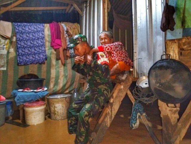 Serda Nurdin, Babinsa Desa Belo dari Koramil 1608-04/Woha, langsung bergerak cepat dengan datang ke lokasi banjir sekitar pukul 02.00 Wita. Ia segera membantu evakuasi warga terutama yang lansia agar pindah ke tempat yang lebih aman saat air mulai naik.