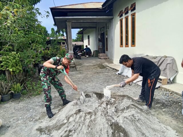 Di tengah terik matahari dan suasana kerja yang penuh semangat, Sertu Puguh tampak bersama warga mengaduk air dan semen untuk melapisi lantai rumah. Tidak ada sekat antara seragam loreng dan pakaian kerja warga. Semua bahu-membahu, saling membantu demi terwujudnya hunian yang layak bagi keluarga Bapak Fauzan.