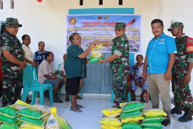 Halmahera Utara, – Dalam rangka memperingati Hari Ulang Tahun (HUT) ke-80 Tentara Nasional Indonesia (TNI), Komando Distrik Militer (Kodim) 1508/Tobelo bersama Komite Nasional Pemuda Indonesia (KNPI) Kabupaten Halmahera Utara melaksanakan kegiatan bakti sosial berupa pembagian bahan pangan kepada masyarakat pesisir.