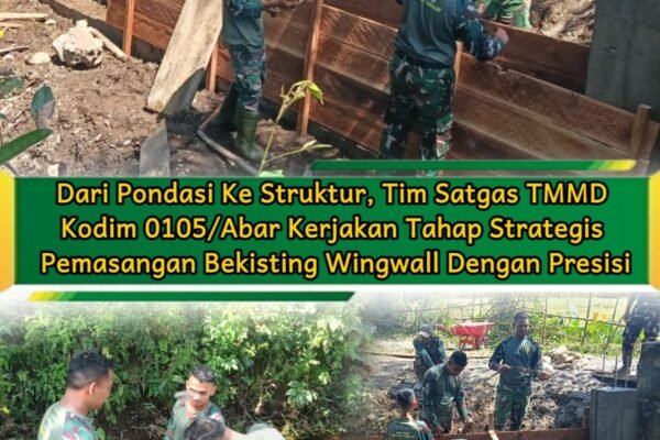 ACEH BARAT – Tahapan strategis pembangunan fisik pada program TMMD Reguler ke-127 Kodim 0105/Abar kini memasuki pemasangan papan mall wingwall di Desa Pasi Aceh, Kecamatan Woyla, Selasa (24/2/2026). Fase ini menjadi penentu kualitas akhir konstruksi. Personel Satgas bersama warga memastikan setiap ukuran, sudut, dan ketinggian bekisting sesuai perhitungan teknis sebelum proses pengecoran dilakukan. Dansatgas TMMD…