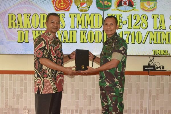 Komandan Kodim 1710/Mimika, Letkol Inf Jozanda, berpartisipasi dalam Rapat Koordinasi Teknis (Rakornis) TNI Manunggal Membangun Desa (TMMD) ke-128 Tahun 2026 secara virtual pada Kamis (16/4/2026). Acara ini berlangsung di Ruang Rapat Makodim 1710/Mimika, yang terletak di Jalan Agimuga Mile 32, Kabupaten Mimika, Papua Tengah. Rakornis tersebut dihadiri oleh para perwakilan dari Pemerintah Daerah Kabupaten Mimika,…