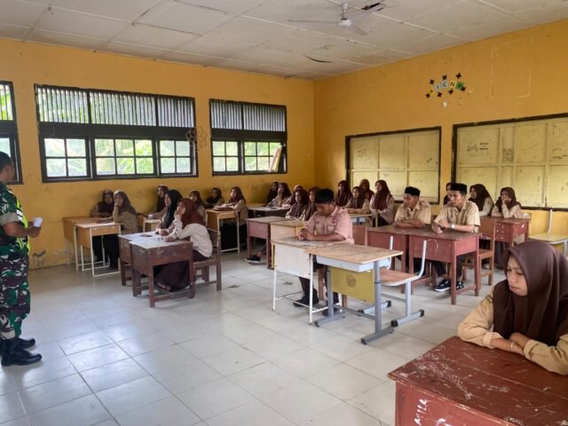ACEH BARAT – Babinsa Koramil 02/Woyla Kodim 0105/Abar Serda Suherman Memberikan Wasbang dan Sosialisasi kepada Siswa-Siswi tentang Cegah Kenakalan Remaja di Usia Dini di Desa Tingkeum Panyang Kecamatan Woyla Kabupaten Aceh Barat, Sabtu (09/08/2025).