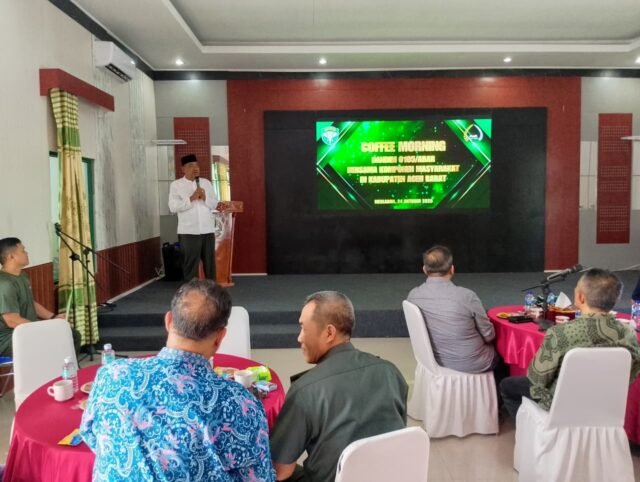 ACEH BARAT – Sebagai langkah memperkuat sinergi dan menjalin kemitraan, Dandim 0105/Aceh Barat Letkol Inf S. Kembaren, S.E., M.I.P., CFrA., mengundang Komponen Bangsa Aceh Barat dalam kegiatan Coffee Morning yang digelar di Aula Makodim 0105/Abar, Jalan Imam Bonjol, Desa Drien Rampak, Kecamatan Johan Pahlawan, Jumat (24/10/2025).
