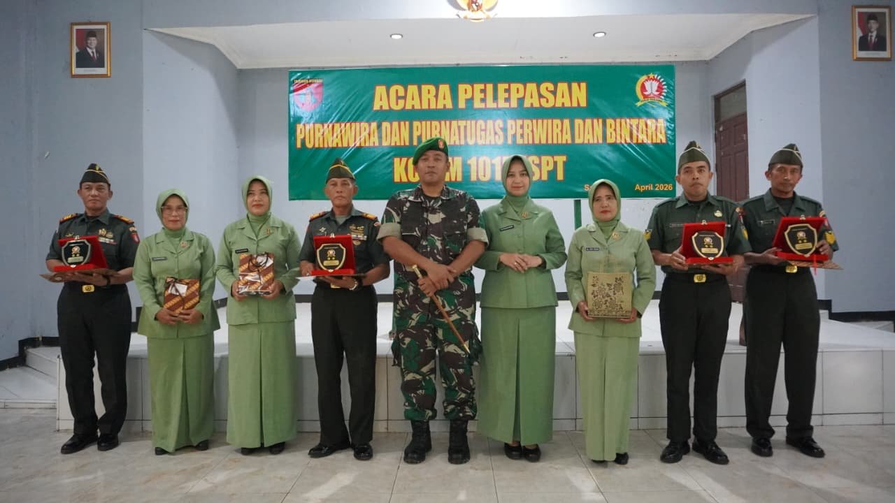 Kotawaringin Timur – Upacara pelepasan purnawira dan purnatugas perwira serta bintara dipimpin langsung oleh Komandan Kodim 1015/Sampit, Letkol Inf Dwi Candra Setyawan. Kegiatan berlangsung di Aula Kementerian Agama Kabupaten Kotawaringin Timur, Jalan Kapten Mulyono, Kecamatan MB Ketapang, pada Selasa (7/4/2026) pagi.