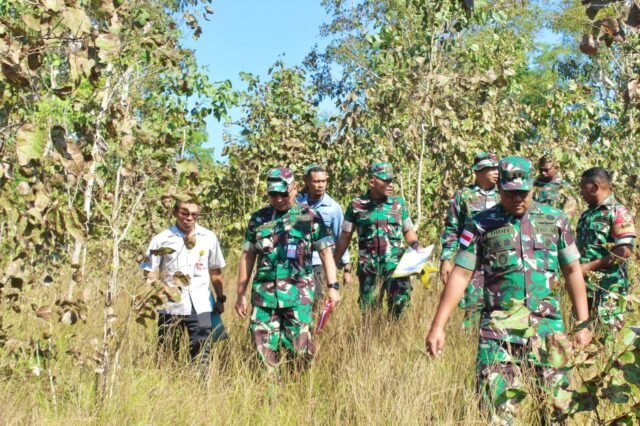 TTU–Kefamenanu, Kamis 24 Juli 2025., Komandan Kodim 1618/TTU, Letkol Arm Didit Prasetyo Purwanto, S.E., mendampingi Tim Survey Lapangan dari Kementerian Pertahanan Republik Indonesia dalam peninjauan lokasi rencana pembangunan Batalyon Infanteri Teritorial Pembangunan (Yonif TP) di Desa Naiola, Kecamatan Bikomi Selatan, Kabupaten TTU. Lokasi yang disiapkan berada di sekitar Kompi Senapan C Yonif RK 744/SYB dengan total luas lahan kurang lebih 50 hektar.