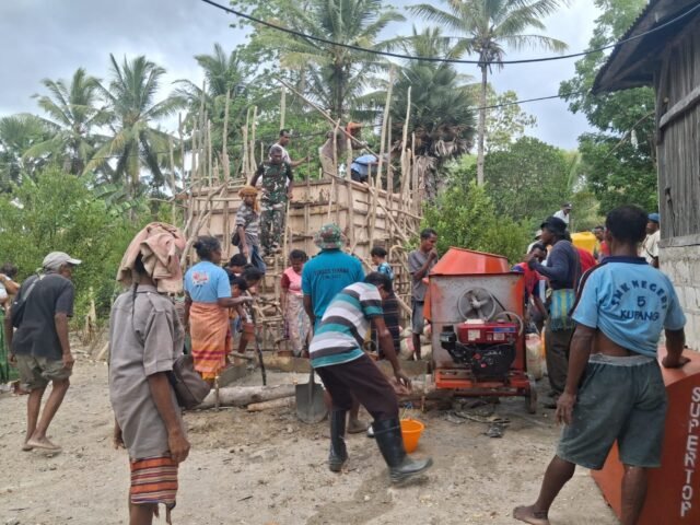 TTS, 12 November 2025 — Babinsa Koramil 1621-02/Amanuban Tengah, Serka Lukas Liu dan Sertu Desemblora Mauboy, bersama masyarakat dan perangkat Desa Sini, Kecamatan Amanuban Timur, melaksanakan kegiatan pengecoran Bak Resofer yang merupakan bantuan dari Kodam IX/Udayana.
