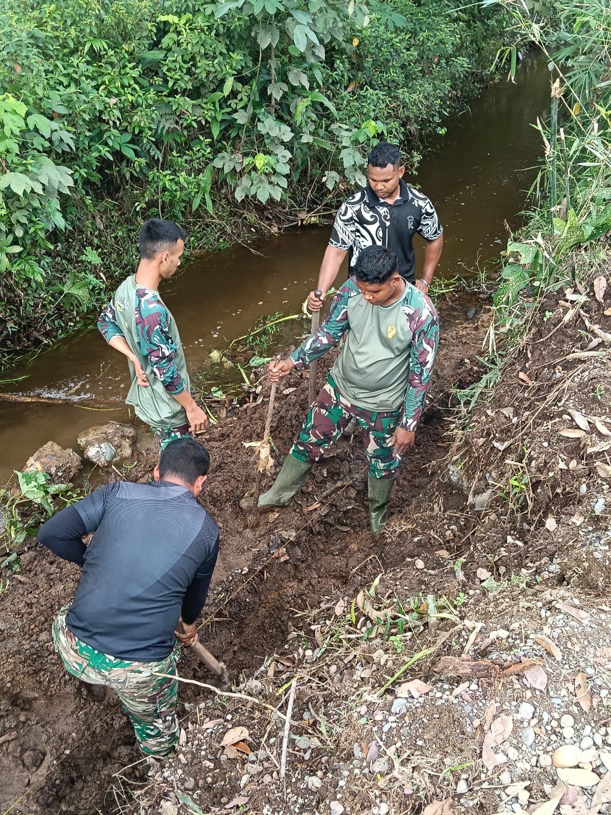 Fokus pekerjaan saat ini adalah penggalian lubang pondasi wingwall yang menjadi bagian penting dari konstruksi penunjang infrastruktur. Dengan alat sederhana dan semangat gotong royong, personel Tim Satgas TMMD bersama masyarakat bahu-membahu memastikan setiap tahapan pekerjaan berjalan sesuai rencana.