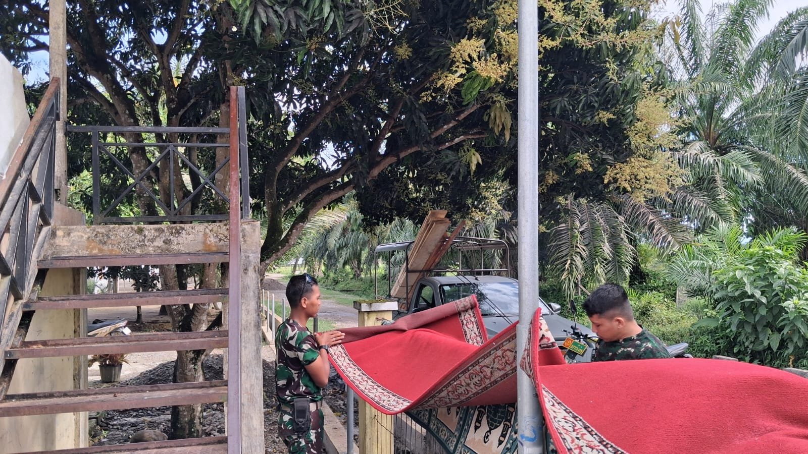 Beberapa prajurit terlihat membersihkan bagian dalam masjid. Debu pada rak Al-Qur’an dibersihkan, lantai dipel hingga mengkilap, sementara bagian plafon juga dibersihkan dari sawang. Di bagian luar, warga bersama Satgas membersihkan parit serta area tempat wudhu.