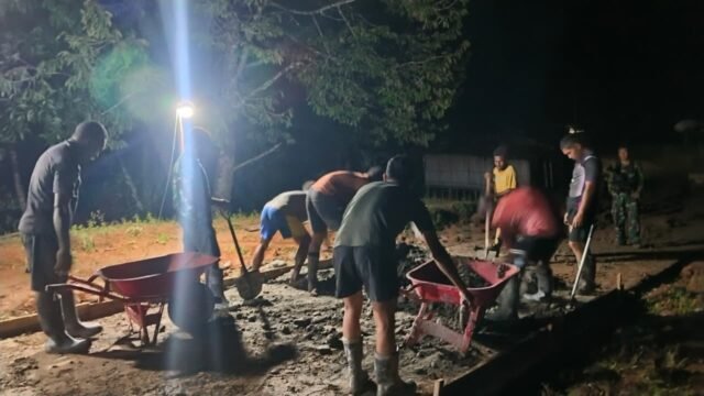 Boven Digoel, Papua Selatan — Dalam rangka mempercepat penyelesaian sasaran fisik TMMD ke-126 Kodim 1711/BVD, para personel Satgas TMMD terus menunjukkan dedikasi tinggi dengan melaksanakan pekerjaan hingga malam hari di Kampung Waropko, Distrik Waropko.