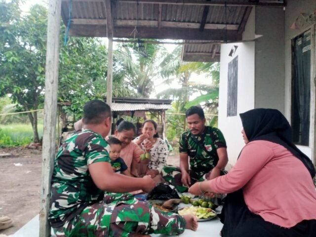 BARITO KUALA – Suasana keakraban begitu terasa di Desa Tumih, Kecamatan Wanaraya, saat anggota Satgas TMMD Ke-126 Kodim 1005/Barito Kuala menyempatkan diri untuk beranjangsana ke rumah warga. Di sela waktu istirahat, para prajurit tampak duduk santai di teras rumah warga sambil menikmati rujak buatan ibu-ibu desa.