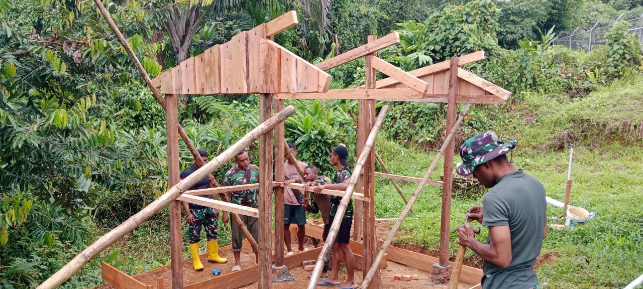Minggu pagi itu, personel Satgas dan masyarakat bekerja berdampingan menata kayu dan menyusun struktur bangunan, mencerminkan kuatnya kemanunggalan TNI dan rakyat di wilayah perbatasan.