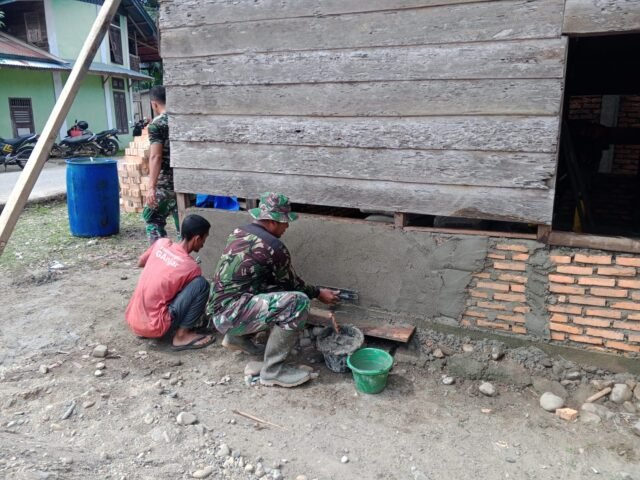 Aceh Selatan – Anggota Koramil 08/Bakongan Kodim 0107/Aceh Selatan di bawah jajaran Korem 012/Teuku Umar bersama masyarakat melaksanakan gotong royong memperbaiki Rumah Tidak Layak Huni (RTLH) milik warga kurang mampu di Gampong Alur Duamas, Kecamatan Kota Bahagia, Sabtu (11/10/2025).